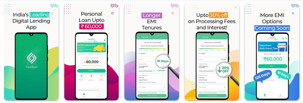 - CashBean offers loans ranging from Rs. 1,500 to Rs. 60,000.